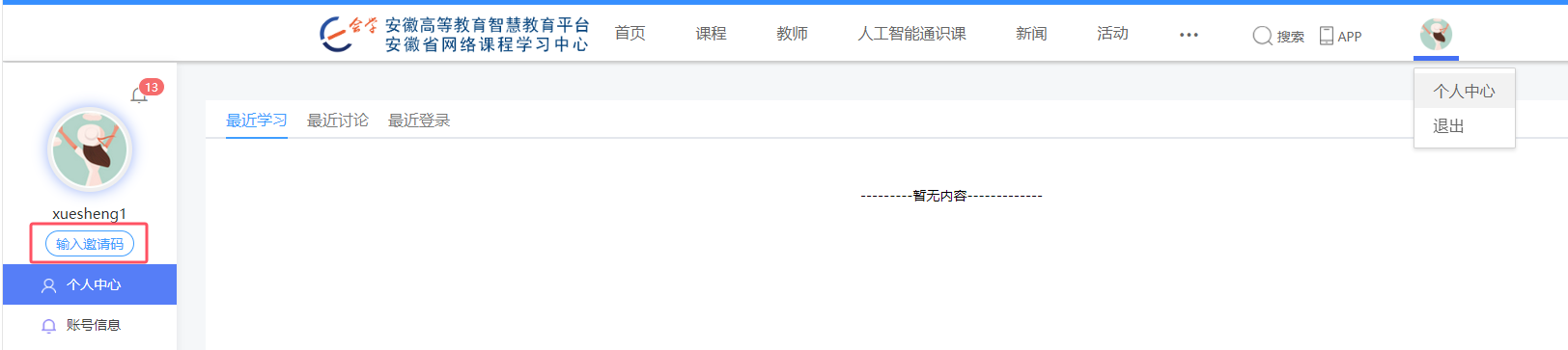 课程教师将班级邀请码发放给学生后,使用网页端时,学生可进入【个人中心】-【加入班级】模块,输入班级邀请码搜索到相应的课程班级并点击加入,加入班级且同时加入课程。