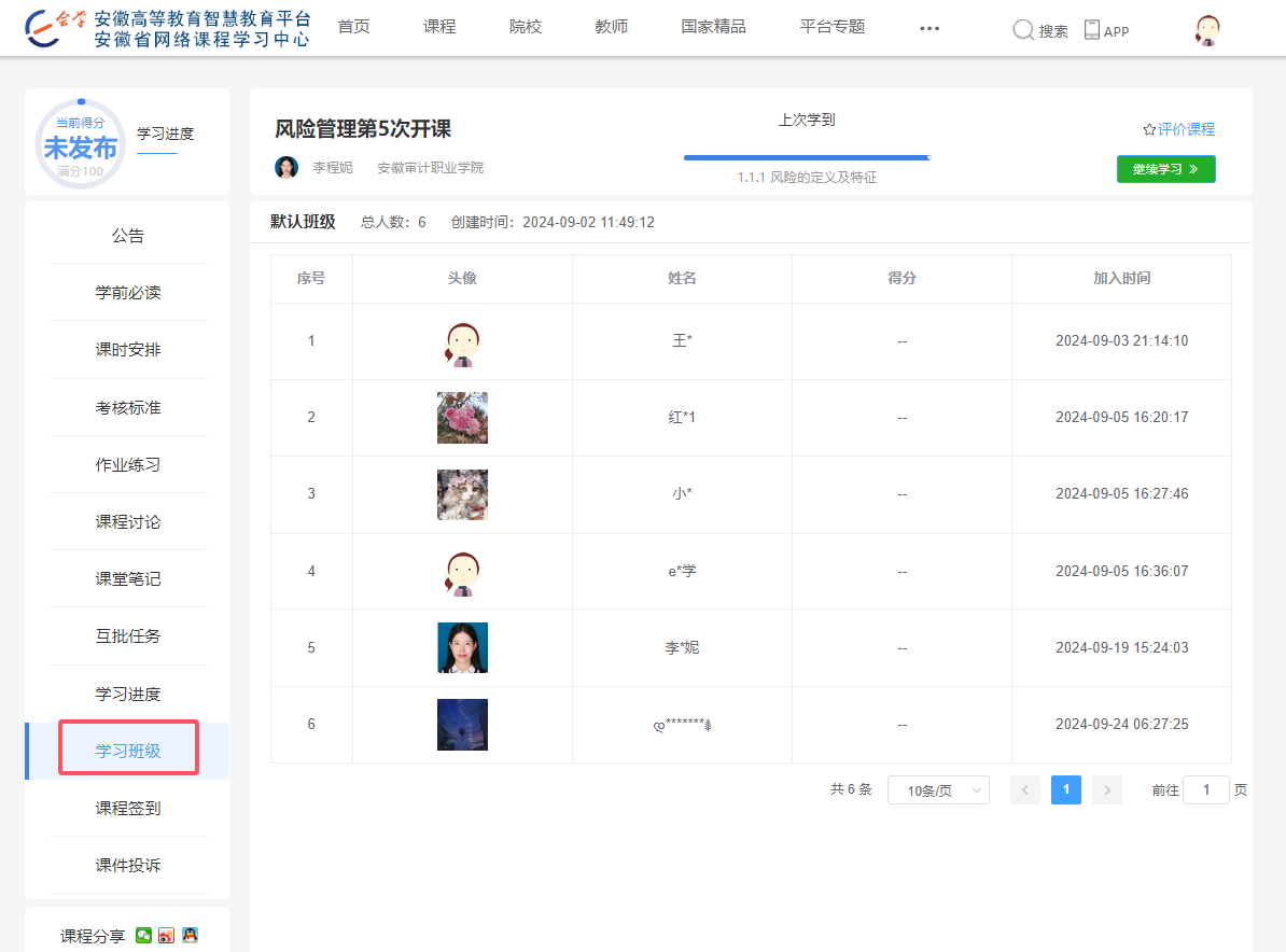 学生在加入课程的同时会加入到课程的默认班级中,在课程学习页面的【学习班级】中可查看自己所在班级,也可查看班级成员。如果后期需加入到课程老师的自建班级中,可根据老师提供的班级邀请码加入相应班级,具体操作流程为:进入【个人中心】中的【加入班级】,通过班级邀请码加入相应的班级。请注意,如果已经加入老师创建的班级(非默认班级)了,则不允许再变更班级,如需变更班级可请课程老师进行移班。