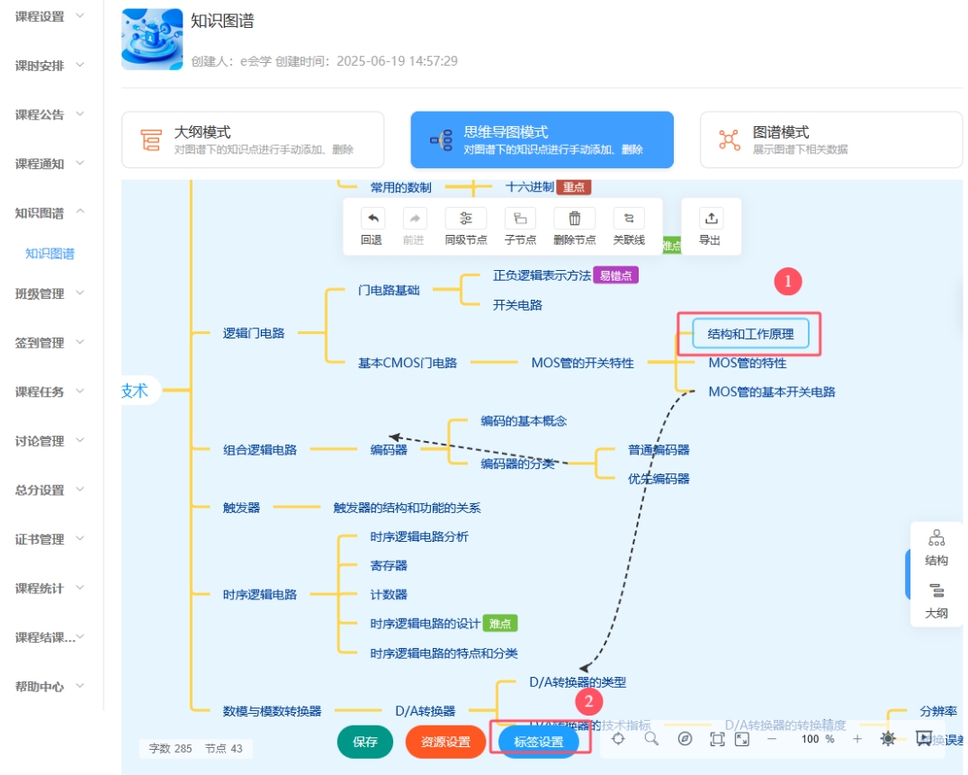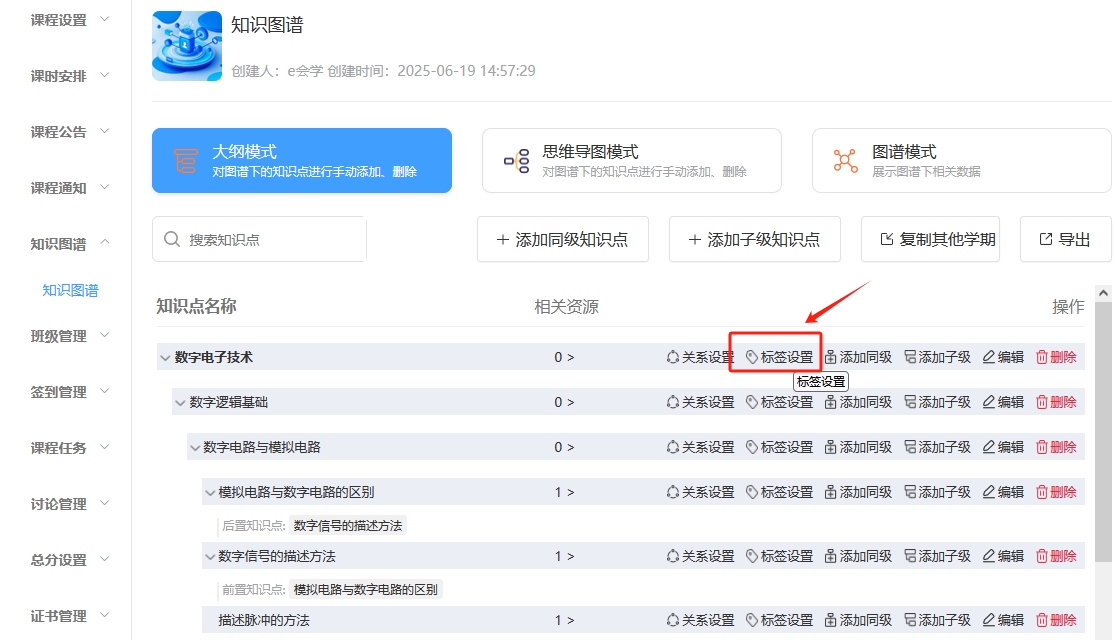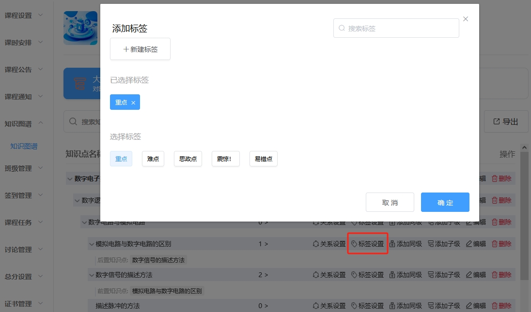 点击【标签设置】即可设置各知识点的标签,支持从平台预设的标签中选择,也支持课程老师手动添加标签后选择使用。