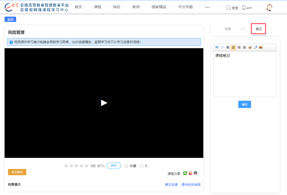 在课程学习过程中可添加课程笔记,通过【课堂笔记】栏目,学生可查看记录的课程笔记,也可将笔记设置为分享笔记,设置为分享笔记后,所有加入该课程的学生都可查看自己分享的笔记,课程笔记同样支持删除。