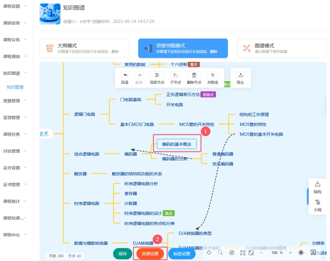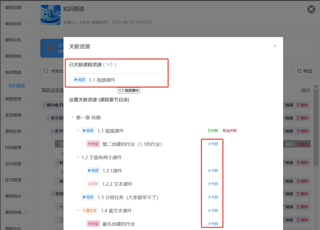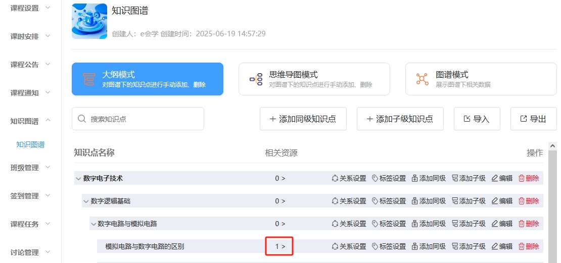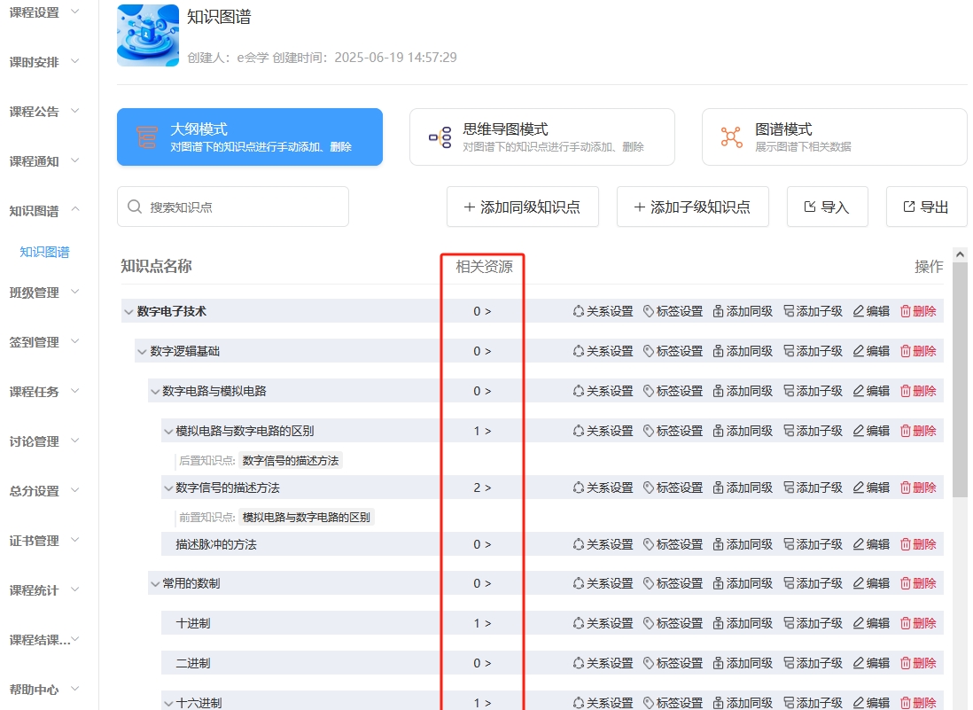 大纲模式中可清晰直观的看到每个知识点是否有关联课程资源及关联资源的数量,点击可跳转查看关联资源。