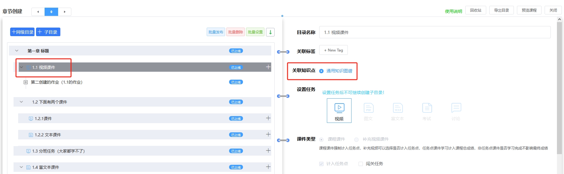 点击课时安排,进入课程章节目录-编辑章节,可以设置章节内容关联已创建好的知识点。