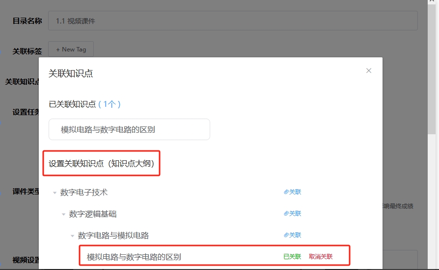 首先选中某个知识点,然后点击【资源设置】,在弹出的关联资源页面设置知识点的关联资源。