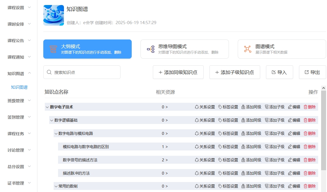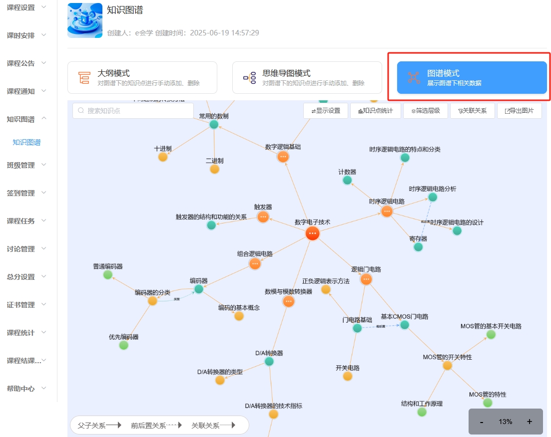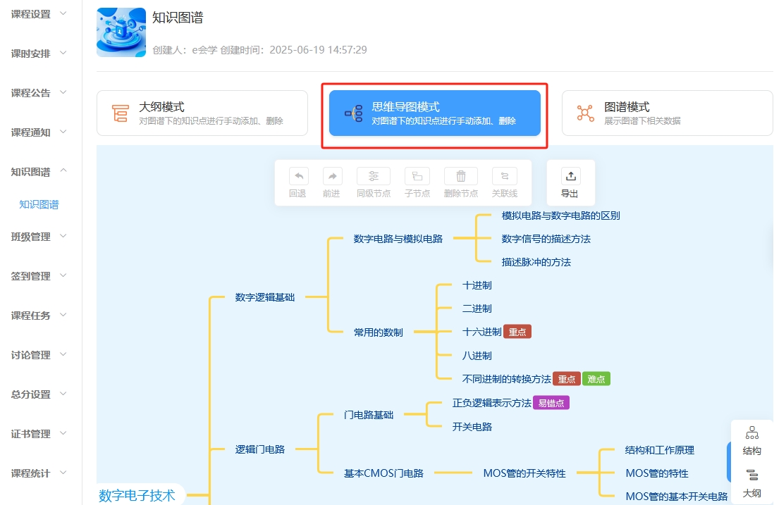 思维导图模式便于用户快速查看课程整体框架结构,知识点父子关系清晰, 也可在思维导图模式进行图谱构建。